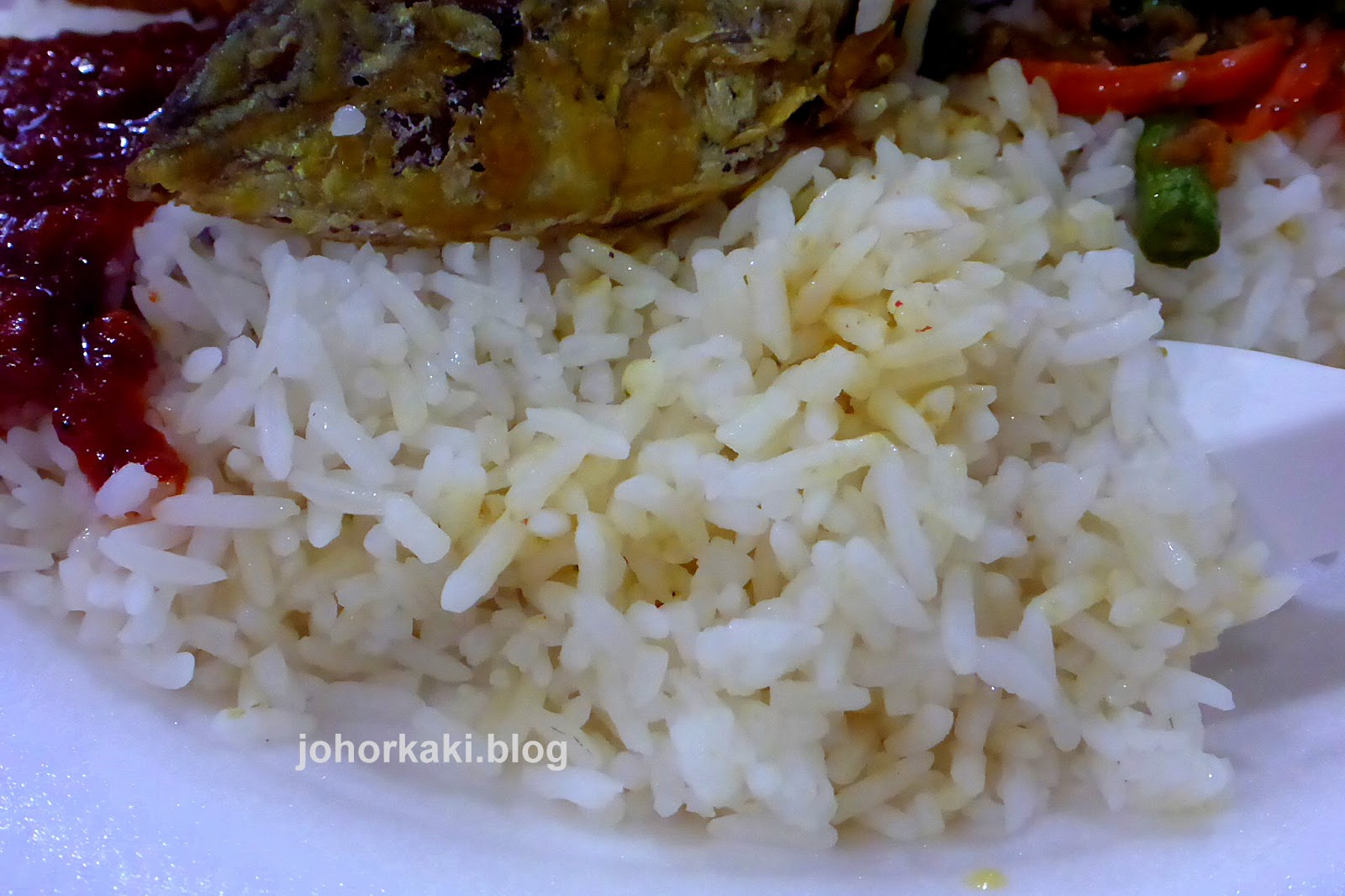 At Chong Pang nasi lemak, the rice is a mix of broken and normal grains - mostly broken. The taste and aroma of coconut milk are strong in the loose rice. It is also quite salty. Quite poor quality rice really.
