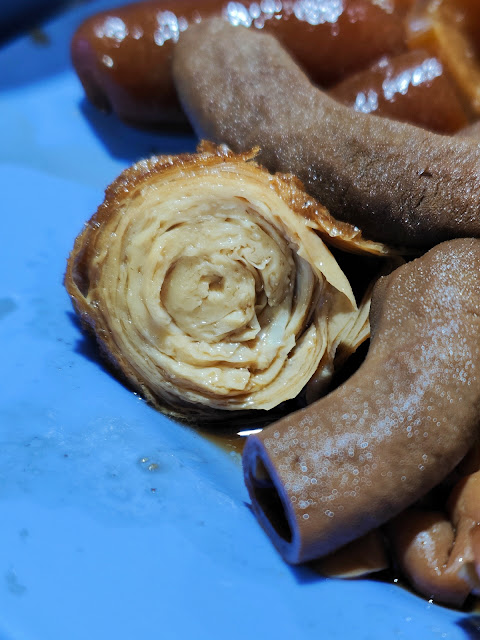 I had big intestine, small intestine, pig skin, and tau pueh (bean skin) roll. Yeah... I very old unker one.